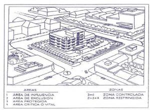 Área o zona de influencia: Es la más externa al objetivo y suele contar con las zonas aledañas al perímetro protegido. Han de ser estudiadas para prever situaciones de riesgo.