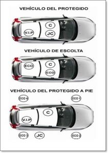 Durante el recorrido de los trayectos el coche de escolta puede ir ocupado por cuatro o tres escoltas, dependiendo del nivel de seguridad que apliquemos al protegido.